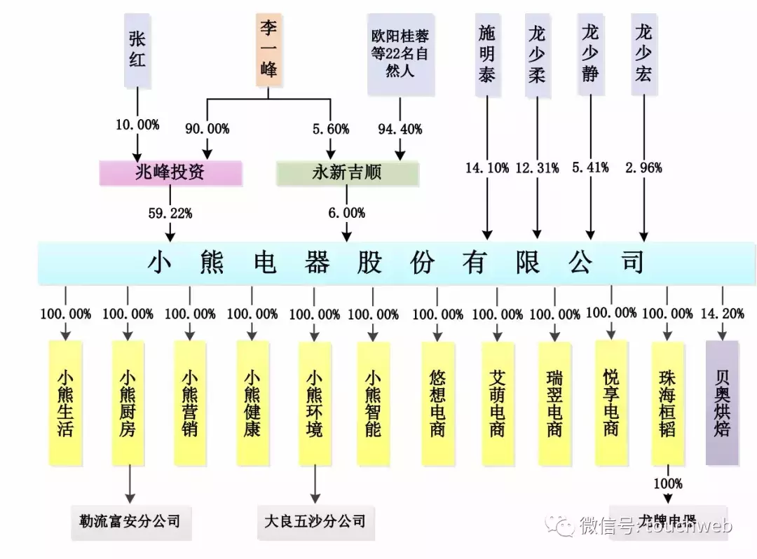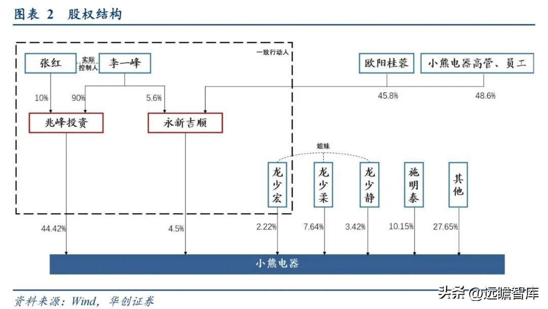 小熊企业股权高度集中且稳定。 李一峰、张红通过控制佛山市兆峰投资有限公司、永新县吉顺资产管理合伙企业(有限合伙)与龙少宏构成一致行动关系,共持有公司50.99%股权,为小熊实际控制人,公司家族性质明显,股权集中,具备稳定的股权结构。