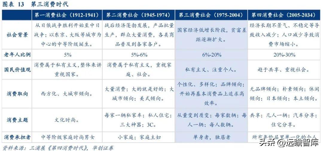 日本消费社会研究专家三浦展在《第四消费时代》一书中将日本社会的消费变迁划分为四个阶段。按照经济环境、产业结构及人口年龄分层等维度看,中国目前正处于个性化、多样化,更看重质量的第三消费时代,相应老龄化人口增多,经济增长重心向第三产业转移,第二产业占比下降。反映在消费行为上则表现为由物质满足型消费向中高端消费以及高效率消费转变。