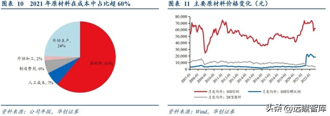 展望后期,原材料价格回落,盈利能力进一步修复。 2021年原材料在主营业务成本支出中占比最大,占比61%,其次为外协生产,占比24%,以塑料、钢材为主的原材料价格波动将对公司盈利能力产生一定影响。20年以来塑料价格持续上涨,直至22Q1有所回落,而这部分原材料价格回落尚未体现出,预计下半年原材料价格对于公司盈利端的修复将进一步体现。