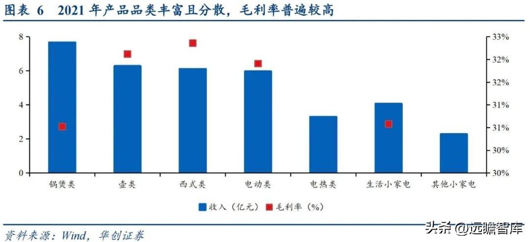公司产品品类分散,属性多为长尾小家电,且毛利率水平普遍较高。2021年主要板块厨房小家电的各产品品类收入相对均匀、分散,且毛利率水平普遍较高,均在30%以上。