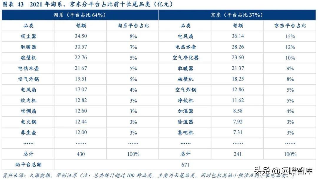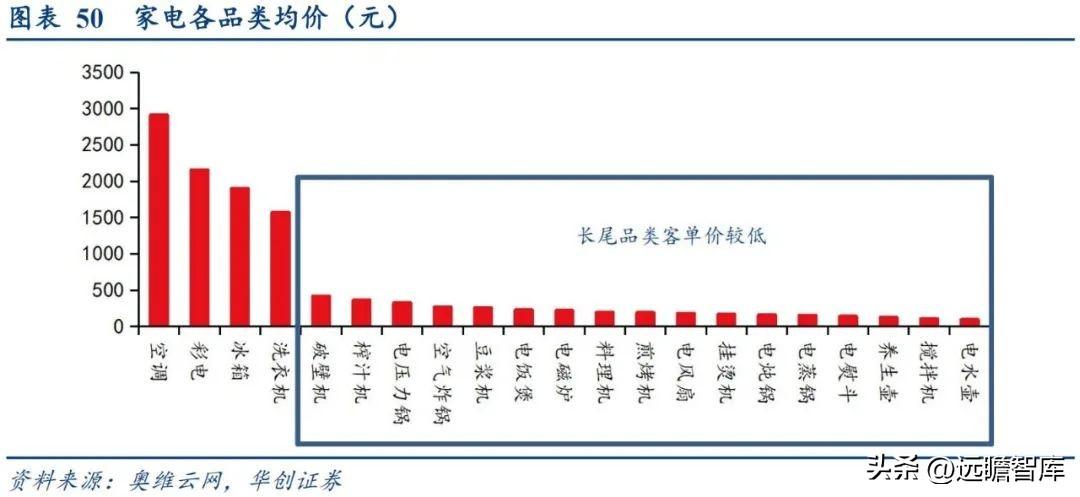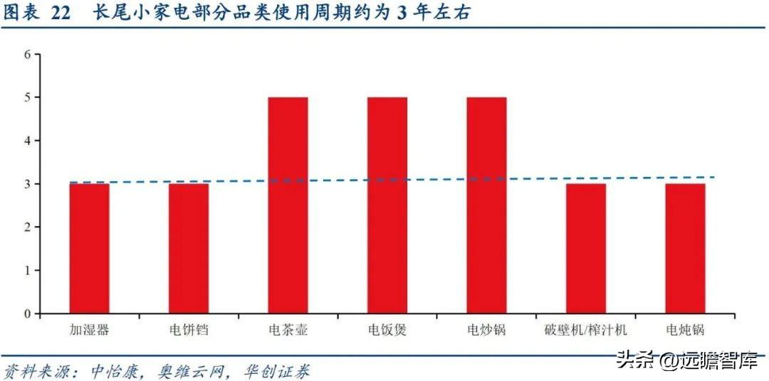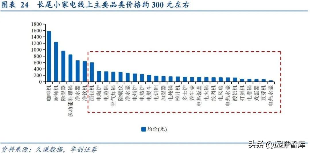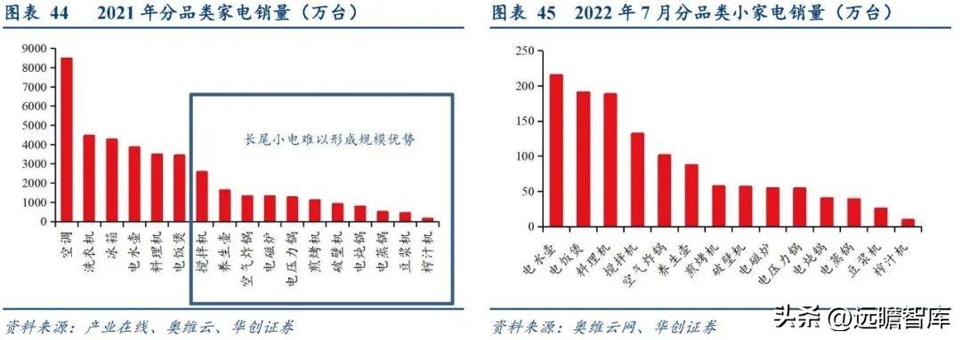 总结来说,长尾品类依赖于多品类叠加广人群覆盖以提升销售基数。 长尾小家电产品品类极为丰富,但因其使用场景局限,单一品类规模普遍偏小、单个价值量低容易冲动消费、购买周期相较于消费品较长的特性下,长尾品类依赖于丰富品类的规模叠加以及广覆盖的庞大消费者基数以提升整体长尾品类规模。