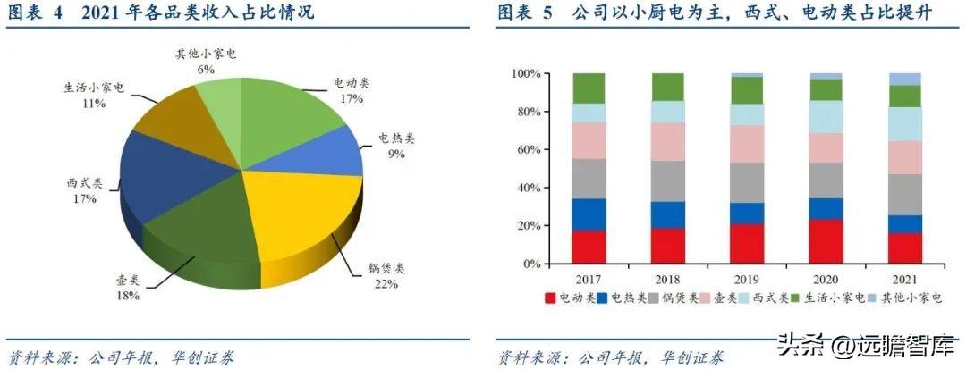 厨房小家电: 厨房小家电在公司营收占比中占比超过80%,为公司的主营业务品类,其中主要分5大细分品类,分别为:锅煲类、壶类、电动类、电热类、西式类。