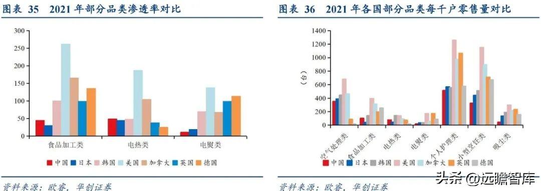 另一方面,从长尾各品类每千户零售量来看,与其他发达国家也存在较大差距,我国空气处理类、食品加工类、电热类、电熨类、个人护理类、小型烹饪类、吸尘类小家电每千户零售量仅为349、100、76、17、512、324台,未来仍具备提升空间。