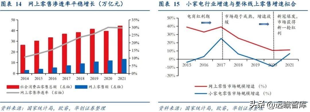 随着网购的兴起,小家电零售规模迅速增长。 根据国家统计局数据,2021年我国网上零售规模超过13万亿,电商渗透率从2014年的10.6%增至29.7%,小家电市场也随之成长。