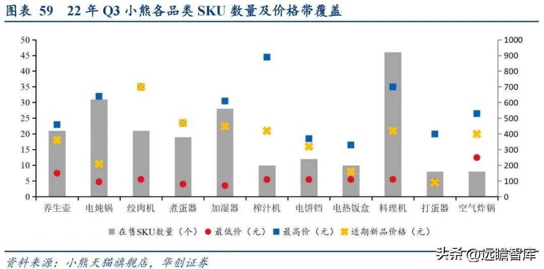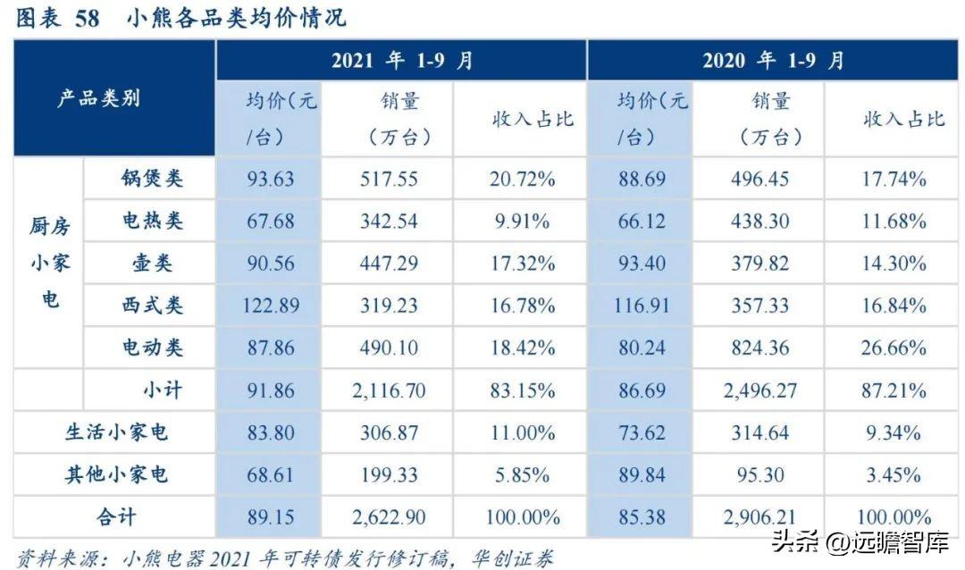 小熊精简SKU,向精品化品牌转型。 过去公司采取多SKU策略抢占市场份额,而21年以来公司进行精品化路线转型, SKU数量在由加法向减法形式过渡。根据公司年报数据测算,2020年小熊共有30多个产品品类,且平均每个品类的SKU约为13个,而至2021年公司平均每个品类SKU精简为8个,且大多数品类均价有所提升,以2020、2021年1-9月销售情况来看公司整体均价提升4.41%,经测算直接由均价提升带来的销售收入增加1.09亿元。