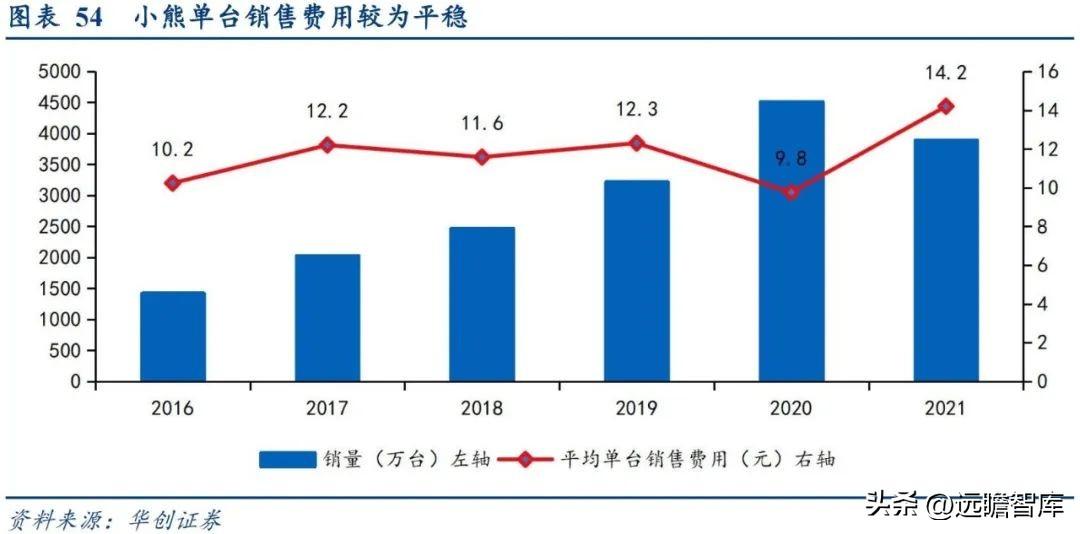 小熊品类布局完善,粉丝群体稳固。 小熊在长尾小家电品类发展已基本实现完整的SKU覆盖,并在前期已经累计庞大的粉丝基础。公司2021年单台产品销售成本为14.2元,5年CGAR为6.8%,早在线上流量费用高企前小熊已在互联网用户群体中建立起自身品牌形象。
