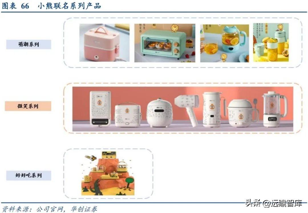 从萌厨形象到年轻人喜欢的小家电。小熊最初以 “萌家电”定位不断提高品牌认知度及市场竞争力,同时通过联名系列产品打造差异化的品牌形象抓住年轻潮流,并推出各类“一人食”产品,迎合年轻Z世代消费观。