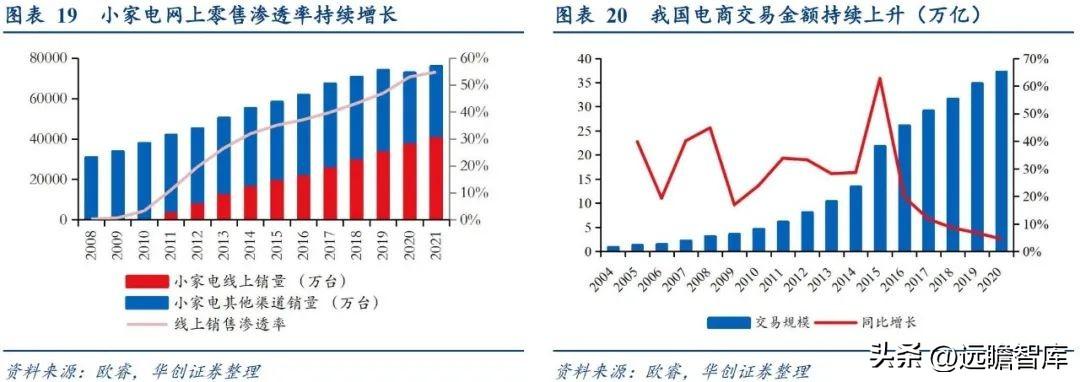 线上渠道已成为小家电主要销售渠道。 根据企查查数据显示, 2010-2015年电商企业注册量同比增速约在80%以上,同期我国电商交易额持续快速提升,而小家电在无需安装、容易冲动消费的特性下随着互联网经济的发展迅速崛起。2021小家电线上零售量年占比已达54.8%,小家电销售方式正逐步向线上渠道倾斜。