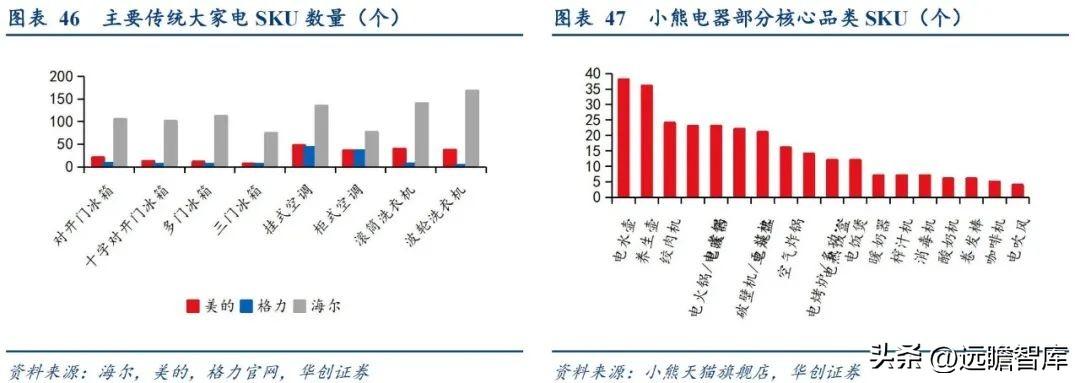 大家电品类集中但SKU繁多: 而传统大家电核心功能及应用场景相对固定,新品类的开发周期较长,厂商更多将精力集中在对现有品类外观、功耗等核心功能属性的升级,故而品类相对单一,但单品类SKU丰富,以海尔为代表,其挂式空调、滚筒洗衣机、波轮洗衣机等品类的SKU已超过100种。