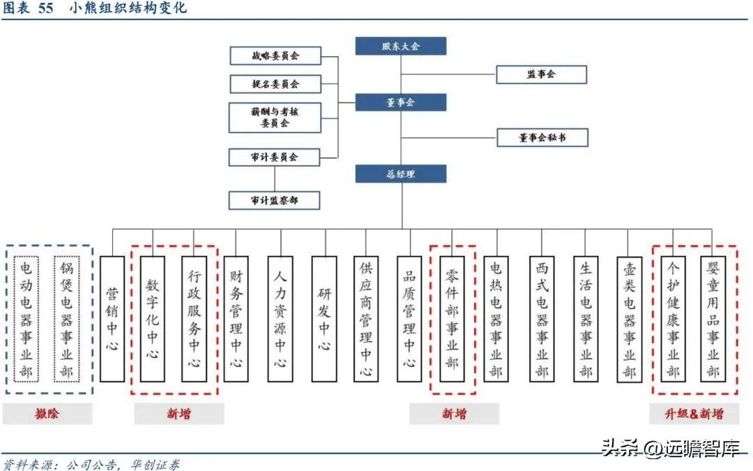 公司进行事业部优化调整同时积极扩充自有产能,中后台升级扩张。小熊于2021年进行组织结构调整。与之前组织结构相比,首先进行事业部优化调整,对事业部与工厂进行改革,提高各部门效率并积极扩充自有产能;其次,撤销锅煲电器事业部和电动电器事业部,新增设婴童用品事业部、零部件事业部,并将个护产品项目部升级至个护健康事业部;同时将管理运营等中后台支持部门升级转换为“数字化中心”。