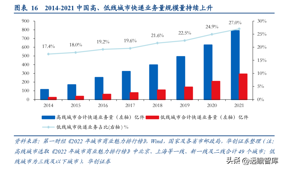 快递业务对低线城市的渗透助力长尾品类渗透触达。 2021年,我国低线城市快递业务量已接近293亿件,2014-2022上半年期间,占总量比例提升至29.0%,且配送时间基本在2-3天。随着低线城市消费者线上购物的占比和频率增加,下沉人群接触小家电乃至线上选购小家电的概率也大幅增加,小家电下沉市场的触达机会进一步提升。