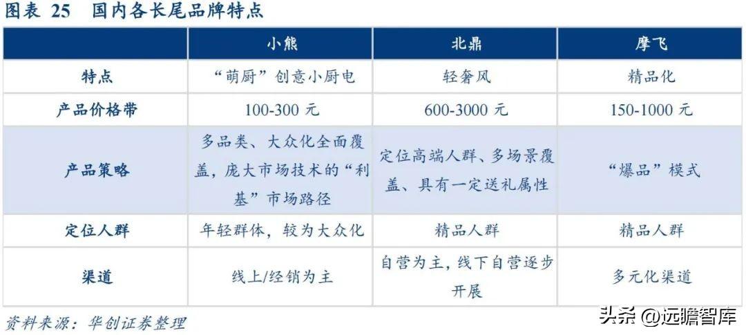 各品牌“玩法”众多,各具匠心。 在我国小家电市场中,布局长尾品牌的主要品牌有小熊、北鼎、以及摩飞,而三大品牌打法各有差异。小熊以萌系厨电为主,过去以产品性价比路线覆盖年轻、大众群体,为标准的利基市场路线,北鼎以高端轻奢路线定位高端人群,而摩飞则走精品化路线善于打造大单品。