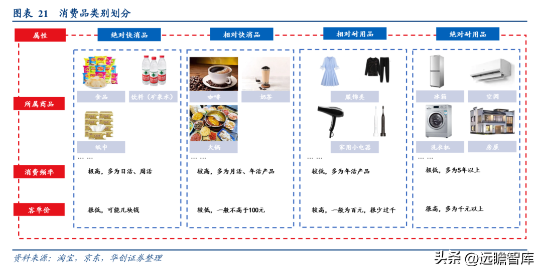 长尾小家电同时具备相对耐用品+相对快消品属性。一般而言,消费品按照产品更新频率以及客单价分布情况,可划分为绝对快消品、相对快消品、相对耐用品和绝对耐用品四类。而长尾小家电产品使用周期一般在5年以下,且其价格带分布多为百元级,极少数产品超千元,覆盖范围较广,由此相比于冰箱、空调等大家电,长尾小家电同时更加具备相对耐用品+相对快消品属性。