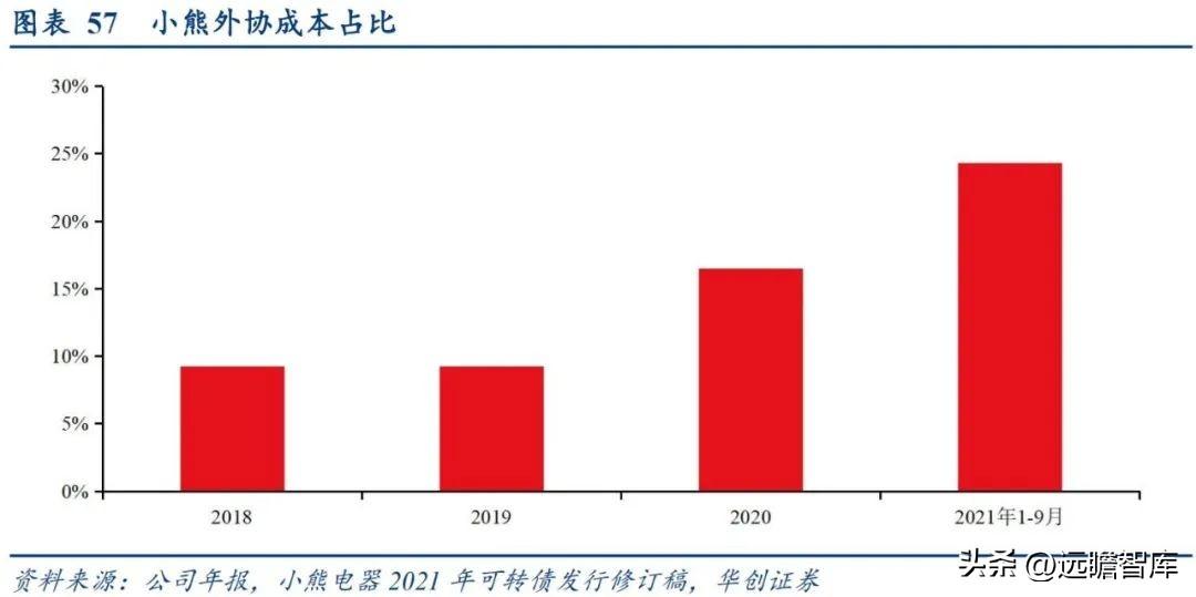 公司积极扩充产能,提升自产比例。 公司目前产能约为3714.08万台,而近年来随着小厨电需求爆发公司外协比例不断提升,2021年1-9月外协在成本中占比达24.32%,较2020全年提升7.85pct,其中主要为西式类小家电外协生产提升。而小熊精品电器制造基地项目已募投完成,建成后每年可1311万台小家电产能,占目前总产能 35.2%,提升自身规模效应的同时减少对于外协加工依赖。
