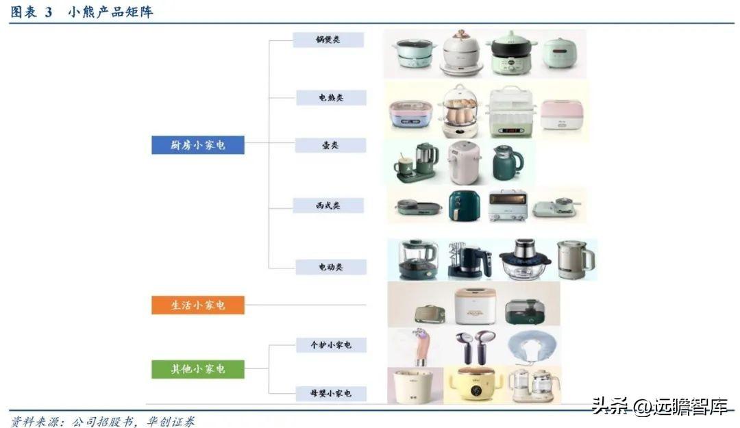 公司产品品类丰富,覆盖范围广。 目前,小熊共拥有60多个产品品类、500多款产品型号,使用对象涵盖母婴、幼儿、青年、中老年人群及其生活与工作的不同场景。公司创意小家电产品分为厨房小家电、生活小家电及其他小家电,其中厨房小家电根据功能进一步划分为锅煲类、电热类、壶类、西式类和电动类五类产品,其他小家电包含个护小家电、母婴小家电等。