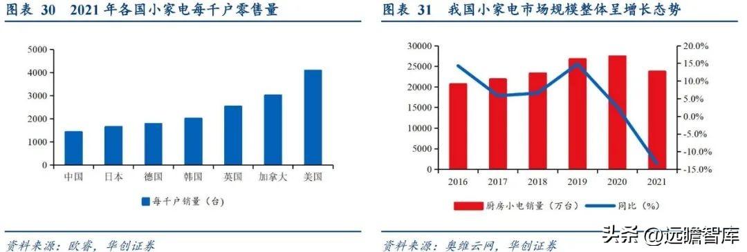 单一长尾赛道低基数下增幅空间大,但绝对规模天花板高度有限。 长尾市场虽然总量规模较大,但由于种类较多,单一品类市场规模有限。奥维云数据显示,2021年厨房小家电12个品类合计零售额为514亿元,依据部分发达国家的经验,预估未来中国厨房小家电市场整体规模将增至目前的2.5-3倍,即1285-1542亿元,单一品类市场规模为百亿左右。
