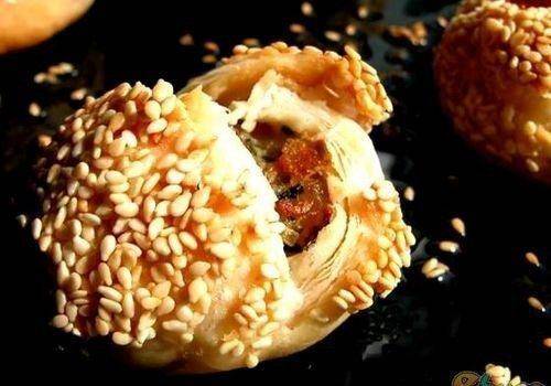 上海人的精致与包容完完全全的体现在这道蟹壳黄中。它采用油酥面加酵面制坯,做成扁圆形饼,饼面粘上一层芝麻,贴在炉壁上经烘制而成。馅料有咸有甜,咸的有葱油、鲜肉、蟹粉、虾仁等,甜的有白糖、玫瑰、豆沙、枣泥等。因饼形似蟹壳,熟后色泽如蟹壳背一样深红,所以称为"蟹壳黄"。