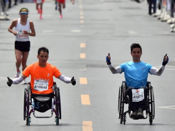 2021年4月18日,杜亚甫(左)参加2021郑开(郑州至开封)马拉松赛。新华社记者 李嘉南 摄