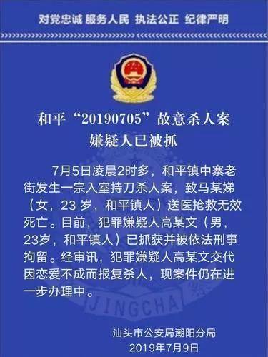 据通报,7月5日凌晨2时多,汕头市潮阳区和平镇中寨老街发生一宗入室持刀杀人案,致马某娣(女, 23岁,和平镇人)送医抢救无效死亡。