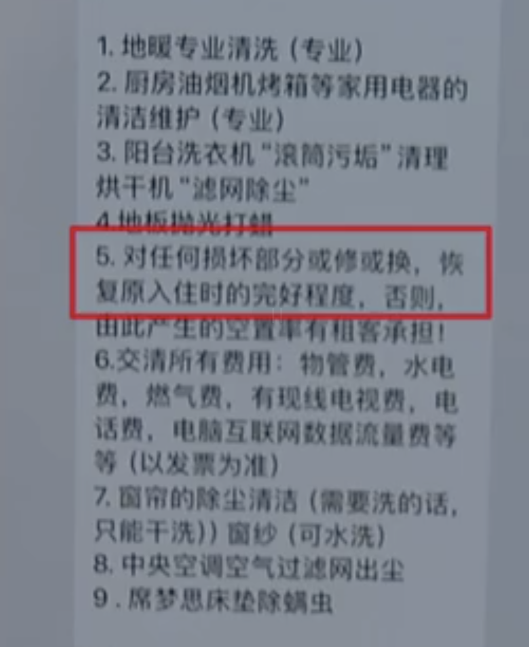 而在提出退租之后,房东给出了一系列的退租要求,包括地暖、油烟机等专业清洁,地板抛光打蜡,甚至还有“恢复原入住时的完好程度”,缴清物业水电等费用。