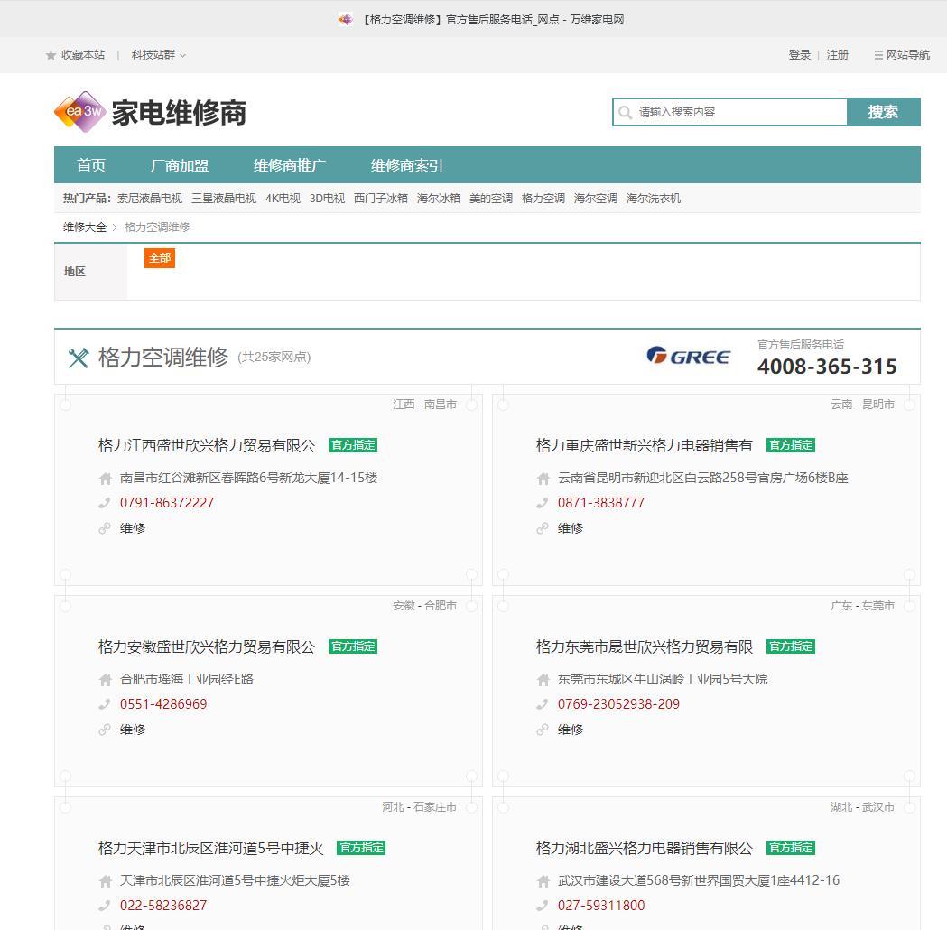 还有网站提供了这些家电品牌全国各地不同的线下售后服务电话。以格力电器为例,该网站在标明了全国官方售后服务热线后注明了不同省市“官方指定”的售后地址与热线。