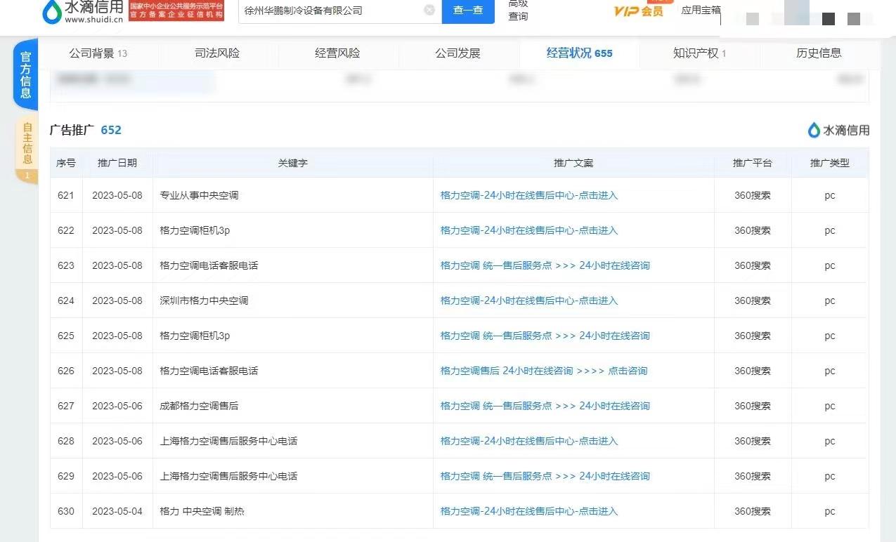 水滴信用平台显示,徐州华鹏制冷设备有限公司在360搜索平台投放了高达652条各类知名家电品牌维修全国客服服务的广告推广,其中关于格力空调的就有不下10条,都是付费山寨维修的广告。