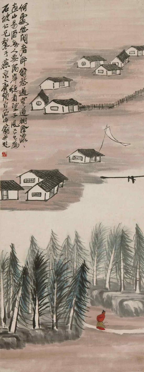 款识:何处安闲著醉翁,愁过窄道树阴浓,画山易酒无人要,隔岸徒看望子风。己巳为石坡仁兄制于燕京。齐璜白石山翁并题。