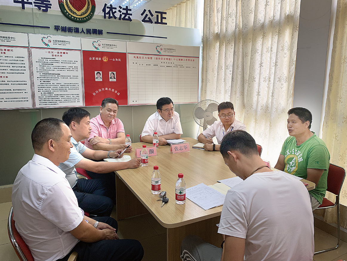 平湖街道党工委书记张志华(右四)参与“我当调解员”活动,深入社区调解纠纷。