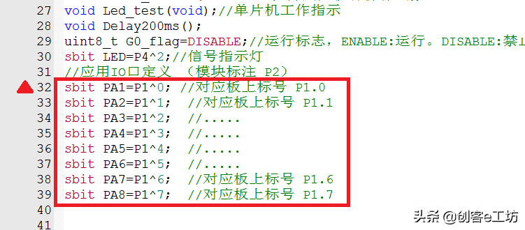 下图就是在主程序前边定义的PA1,“sbit PA1=P1^0”就是令P1^0=PA1,这样子PA1代表的就是P1^0端口。红色框框中的都是定义好的端口,我们后面用到这些时可以直接用,无需再去定义。