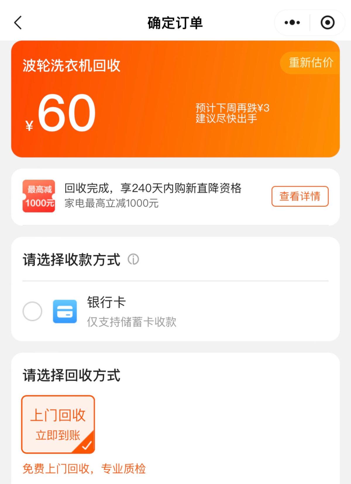 市民需要回收家中的旧家电,在手机上应该如何操作?在苏宁易购中原万达店工作人员的指引下,记者尝试使用苏宁易购小程序,填写了一台8年机龄的波轮洗衣机,回收价格为60元,且页面显示可以立即打款到银行卡,之后再上门回收。