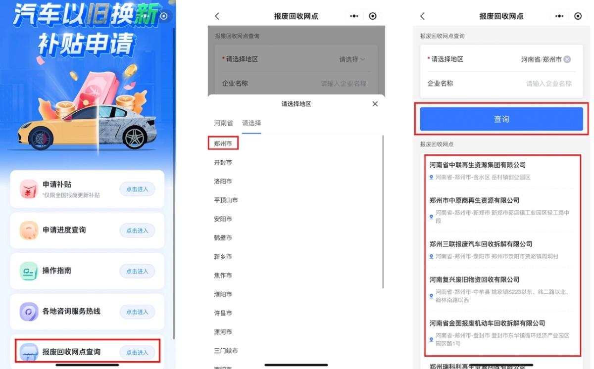 以在郑州市回收旧车为例,在小程序中点击“报废回收网点查询”,再选择地区,点击“查询”,即可看到在不同城市,提供汽车报废回收的服务商。其中选择河南省/郑州市,显示有十多家回收拆解企业。