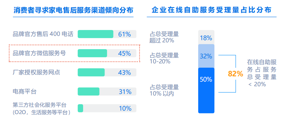 45% 的消费者都倾向选择微信服务号发起维修退换等自助服务。从企业角度来看,实现