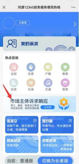 ▲进入“河源12345热线”微信公众号,点击“微服务”,进入后点击“市场主体诉求响应”。