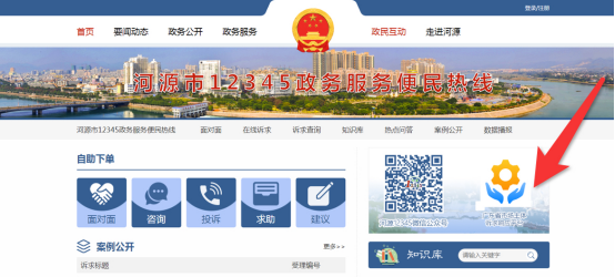 ▲打开河源市人民政府网——政民互动——河源市12345政务服务便民热线,或直接输入以下链接“http://www.heyuan.gov.cn/hd/”,进入后点击右边图标“广东省市场主体诉求响应平台”。