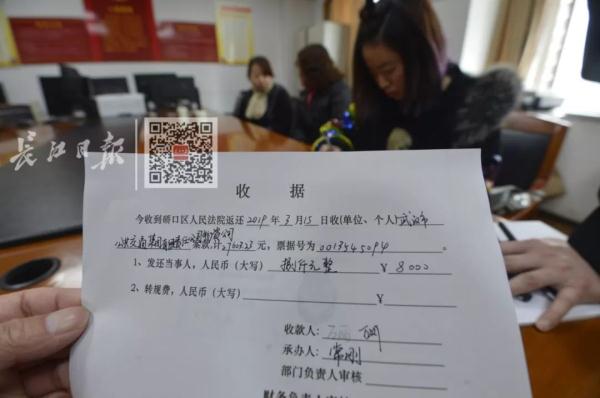 今天上午10点,赵璇带着父亲赵先元如约来到武汉市硚口区人民法院,通过执行局,将10.5万元欠款分别还给3名债权人。