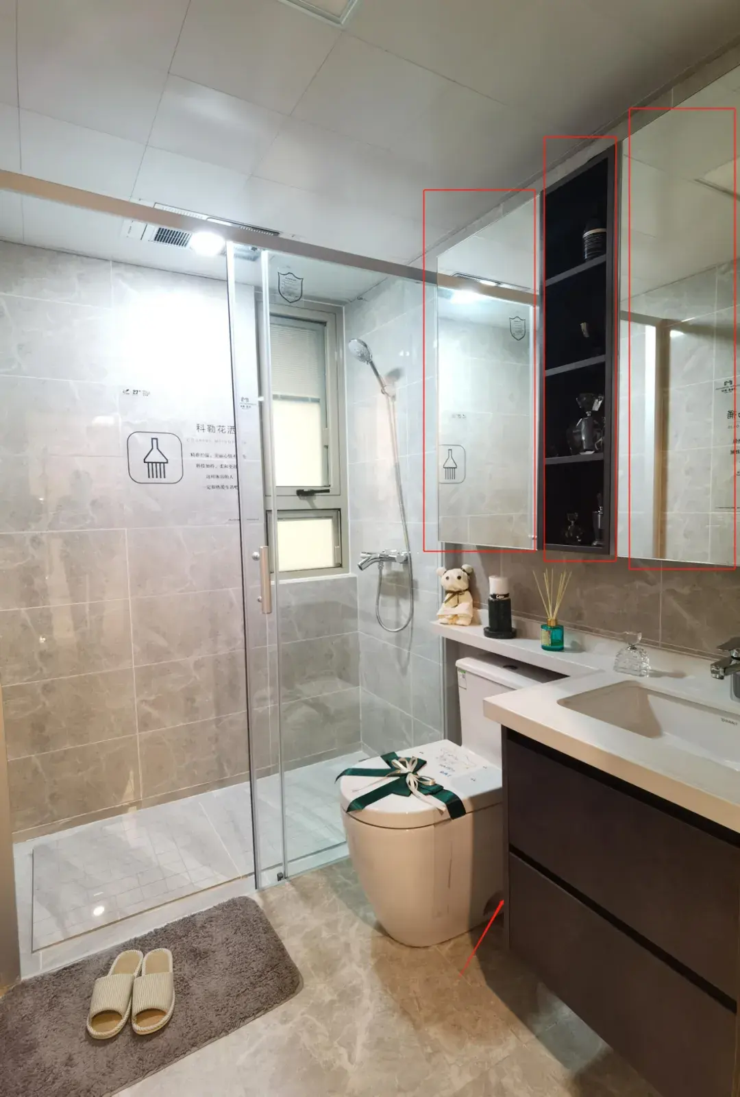 安全方面,配备电热毛巾架 防止毛巾因潮湿而滋生各类细菌;使用的恒温花洒 防止老人、小孩烫伤;淋浴间特设中岛功能,更防滑,也更易于打理……