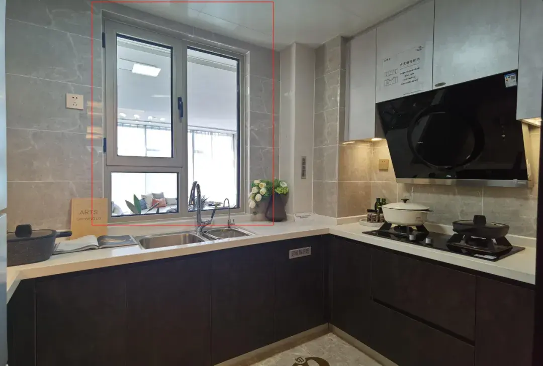比如说,厨房的吊滑门设计 ,地面没有轨道,既不会藏匿油污,也方便了后期配备扫地机器人来做清扫工作。