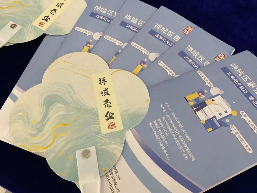 平台宣传册与“禅城惠企”主题漆扇,扫码即可享受一站式政策服务