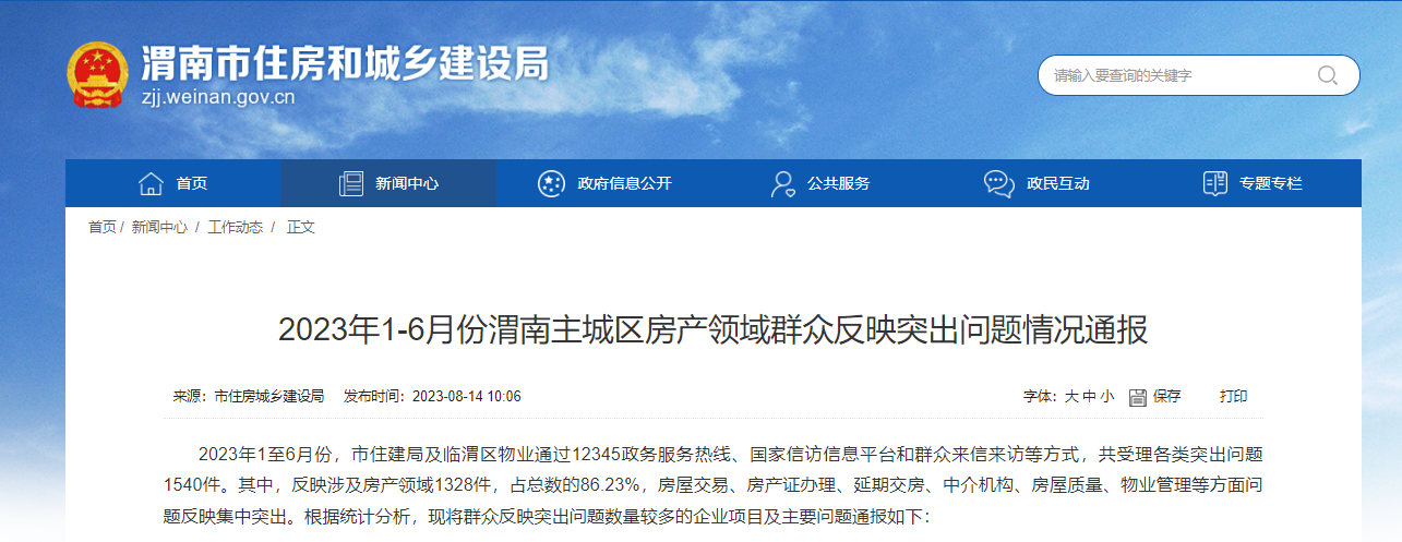 通报显示,2023年1至6月份,渭南市住建局及临渭区物业通过12345政务服务热线、国家信访信息平台和群众来信来访等方式,共受理各类突出问题1540件。其中,反映涉及房产领域1328件,占总数的86.23%,房屋交易、房产证办理、延期交房、中介机构、房屋质量、物业管理等方面问题反映集中突出。根据统计分析,群众反映突出问题数量较多的企业项目及主要问题如下: