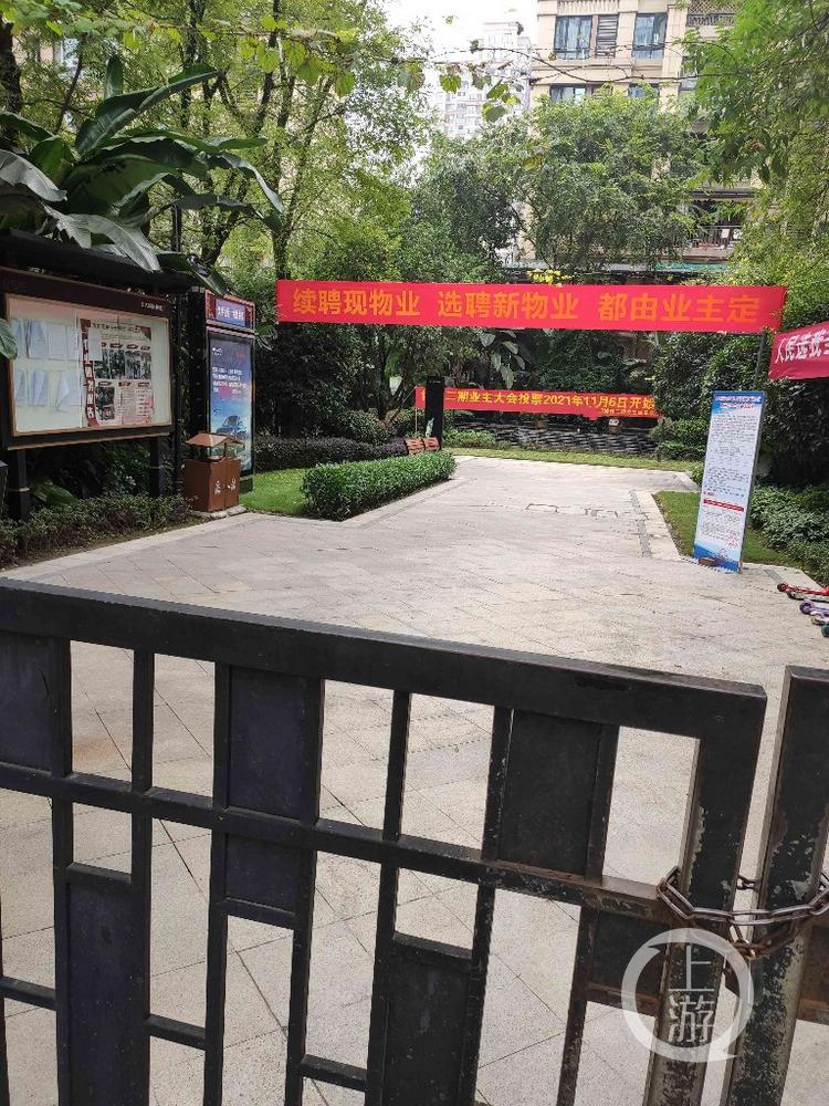 记者在小区一处大门口看到,该小区“第二次业主大会表决票”的易拉宝已经放在小区进门口醒目位置,上面写到该小区已经成立业主委员会,根据《重庆市物业管理条例》相关规定,业主委员会成立后该小区前期物业服务合同已经到期。根据相关规定,对是否续聘现有物业、是否授权业委会公开选聘新物业进行公开表决,并附上样票和填写,以及投票时间等。而在小区进出门口和道路边上,已经拉上了红色的宣传条幅,表决投票时间为11月6日到20日。