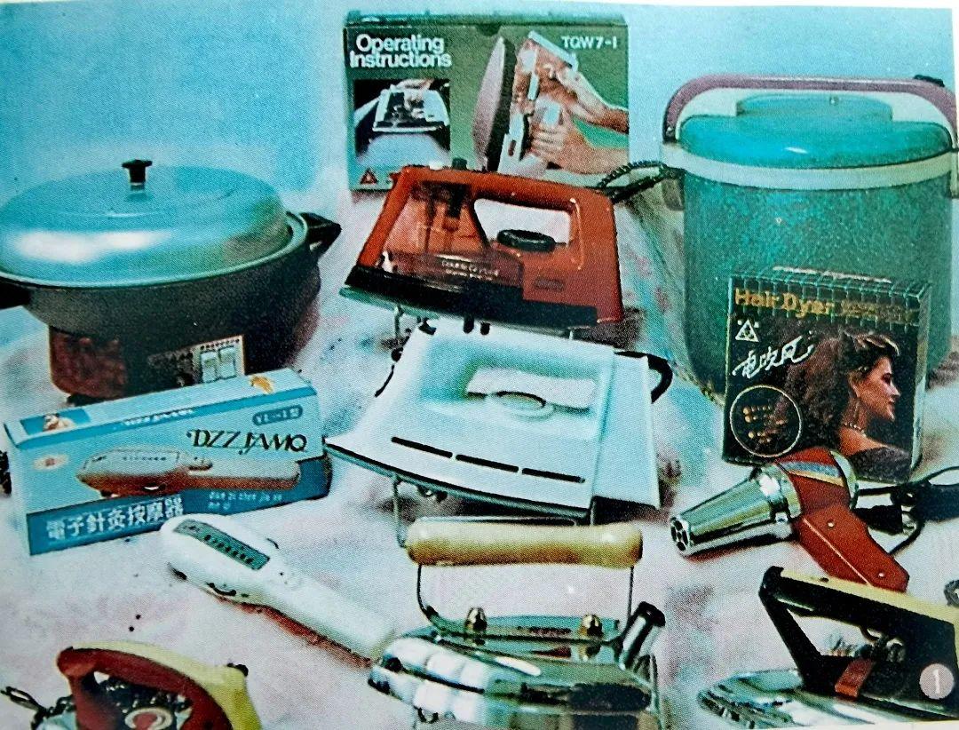 家电总厂 生产多种电熨斗、电热淋浴器、调温电饭锅、煤气点火枪、调温铸铁电炒锅、电门铃、调温电热毯、电动机、台风扇、电门铃、食品加工机、多功能电热锅、 汽化油炉、 电子针灸按摩器、果汁机、自动洗手干手器、厨房多用机、消毒柜