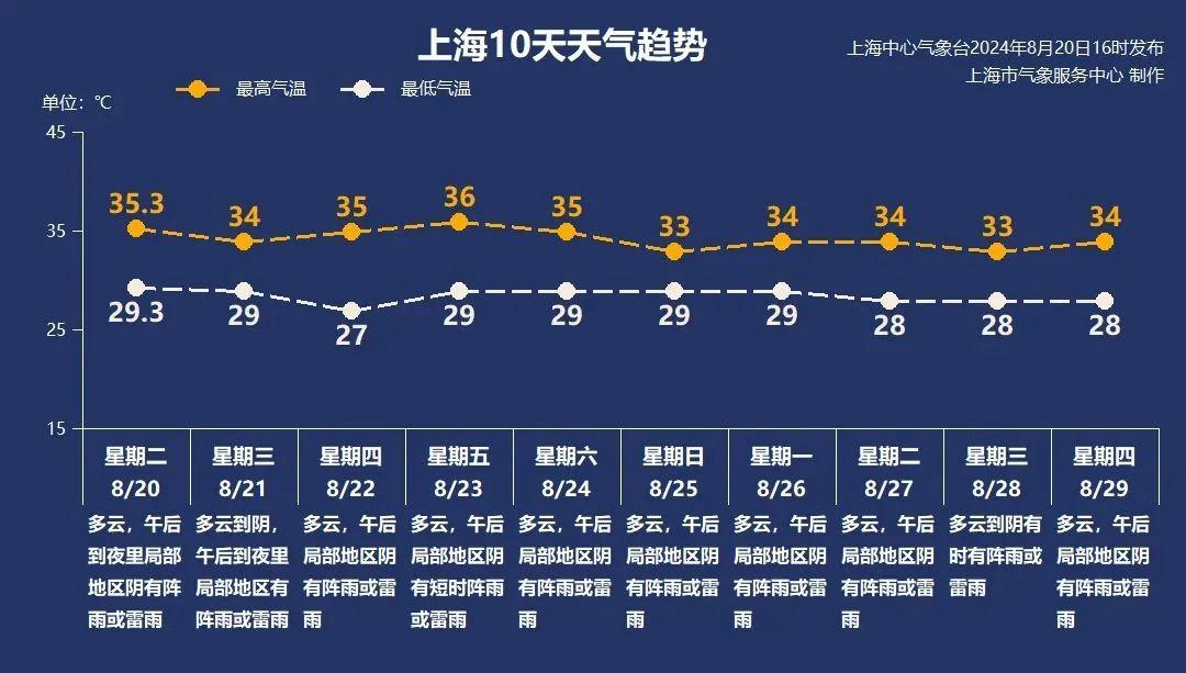 【多日高温】 明天(8月22日)一直到周六,上海会出现新一轮连续高温天气 ,最高温度在36℃ 左右。