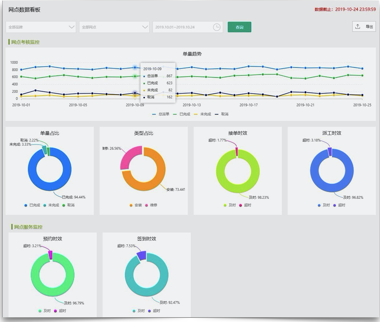 速家数据业务中台包括订单中心、结算平台、商城三个部分 ,通过其网点功能, 可实现网点画像与管理赋能、智能派工、自动结算、自主采购备件等功能。