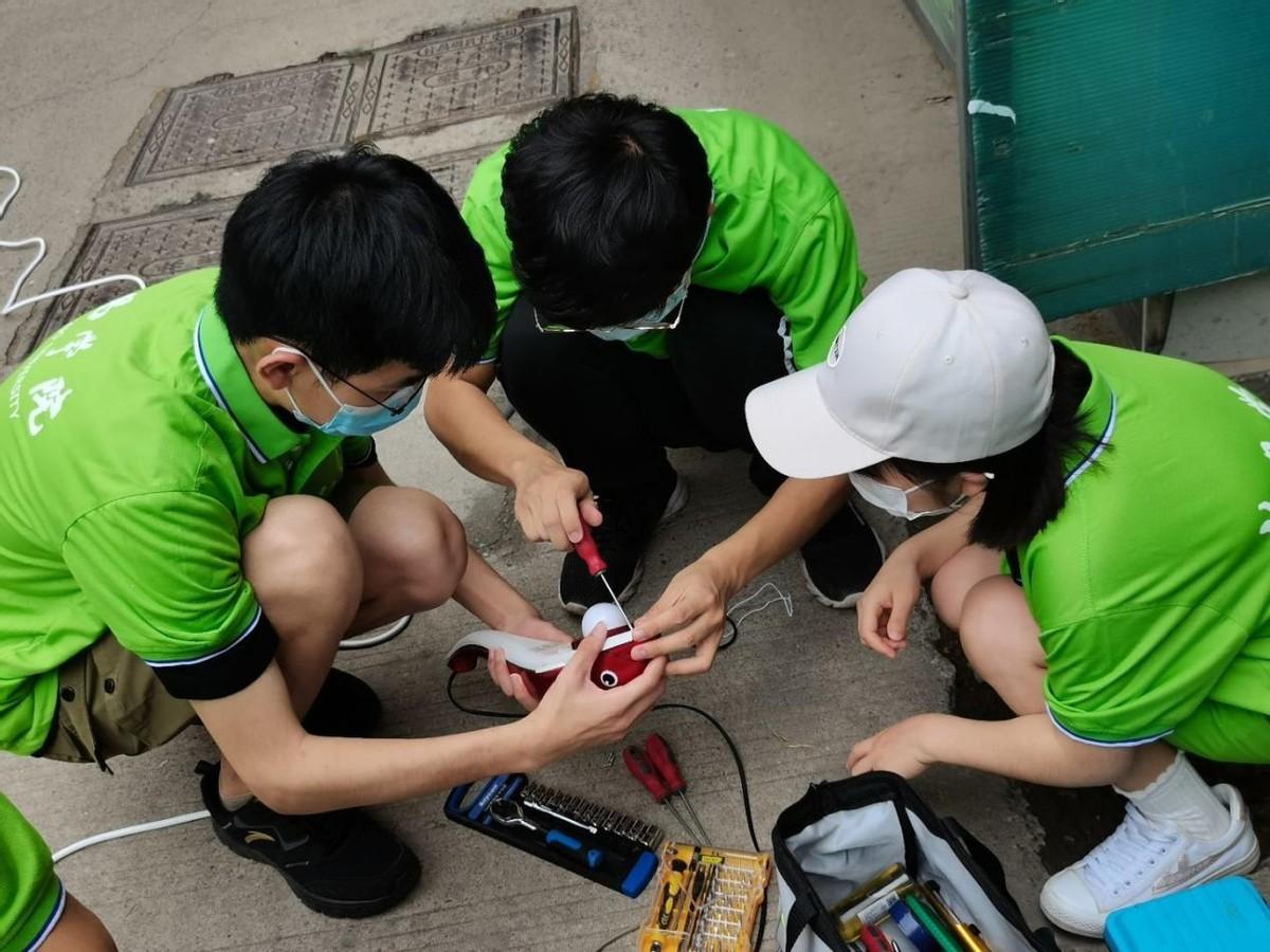 正值烈日夏季,随着电风扇、空调等电器的使用频率次数增多,电器短路、风扇不转等系列故障。对于一些体积较大的风扇,社区的居民可能较难搬动,不过在男生们自告奋勇的热情帮助下,登门拜访,成功将风扇搬运到党群服务中心提供的维修场地中。在平时的理论课程学习上队员们已经有了系统的解决方法,对于能将理论知识投诸于实践中的这个难得机会,队员们纷纷干劲十足,撸起袖子埋头苦干。在耳畔传来的阵阵揶揄声以及居民们因家电被修好而露出的真挚又朴实的微笑中队员们突然感受到了志愿实践后哪种语言无法轻易描述的满足感和成就感,这一刻,所有的队员们觉得再累再热都是值得的。