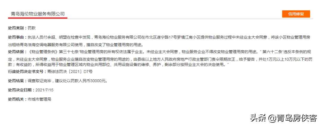 2021年4月,青岛海伦物业服务有限公司在市北区遂宁路17号梦境江南小区提供物业服务过程中未经业主大会同意,将该小区物业管理用房出租给青岛浩海空调电器服务有限公司使用,擅自改变了物业管理用房的用途,被青岛市城市管理局行政处罚3万元整!