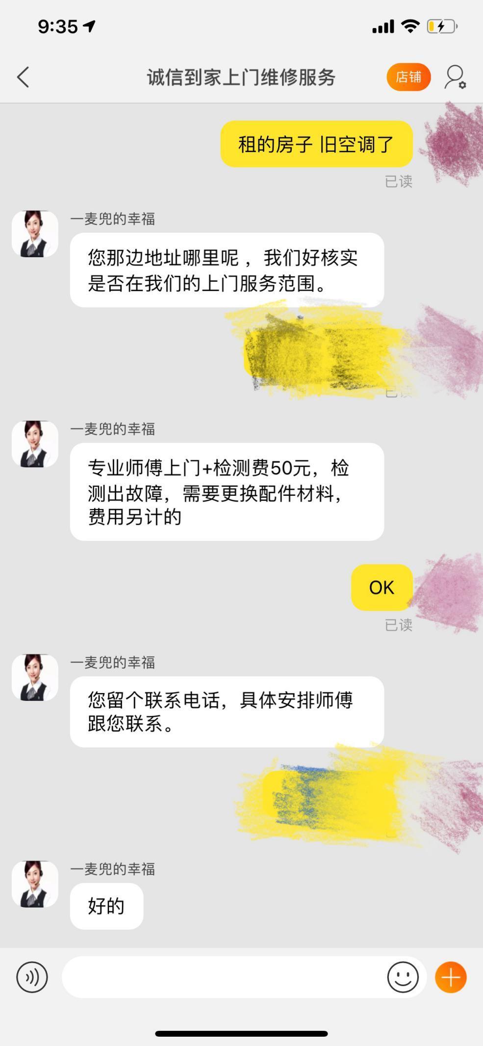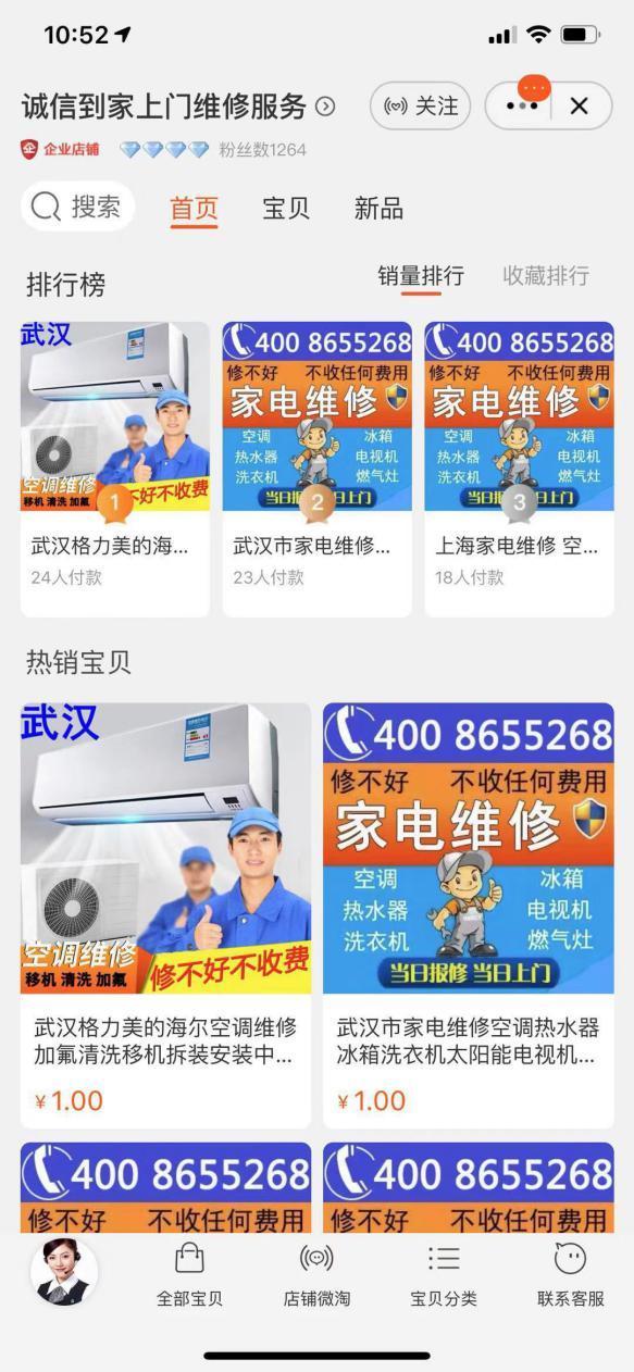 上周,爆料人某女士家里的空调开始出现漏水的状况,于是她在淘宝平台上搜索到一家店名为“诚信到家上门维修服务”的店铺,在某女士把需求表达之后,客服没有提示她在线拍下产品,而是直接让她留下了手机号码,并表示稍后让修理师傅联系她。
