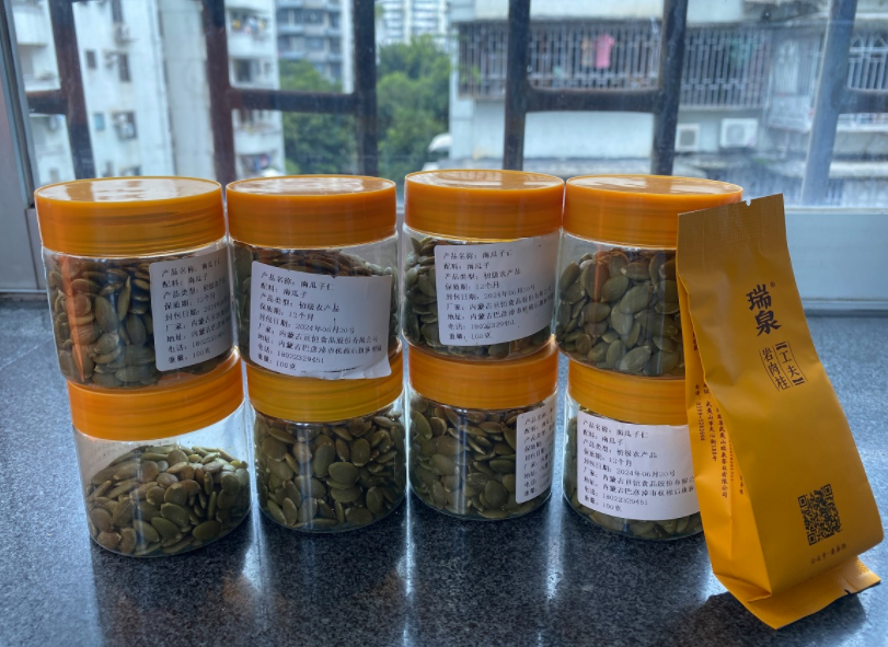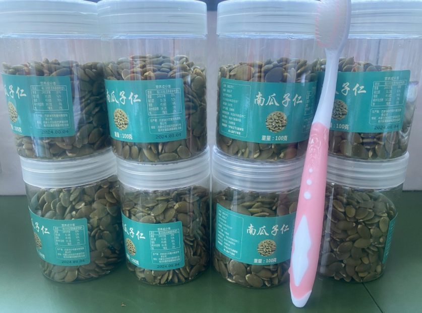 主播面前摆放着8个圆柱形罐子,里面装满了南瓜子仁。目测单个罐子直径约8厘米 ,高度超过了20厘米,罐内南瓜子仁预估500克。