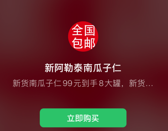 该视频广告的背景是一间大货仓,画面打着“正宗新疆南瓜子仁”“真材实料产地直销” “好吃不贵拍一发八”字样,购买链接处写着“全国包邮”“新阿勒泰南瓜子仁”“新货南瓜子仁99元到手8大罐 ”。