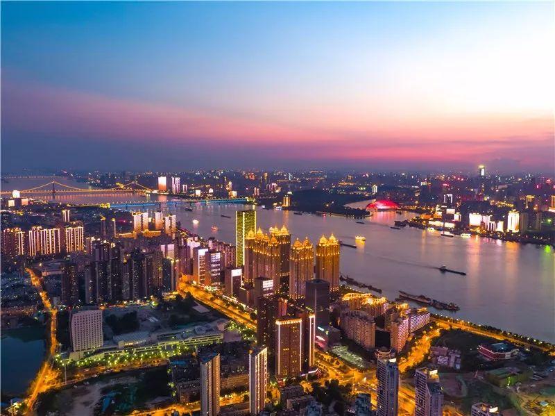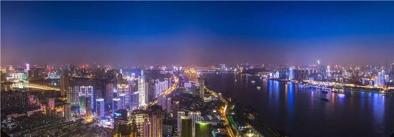 夜幕下,一幅宏伟画卷徐徐展开。灯光中,江城武汉美轮美奂。