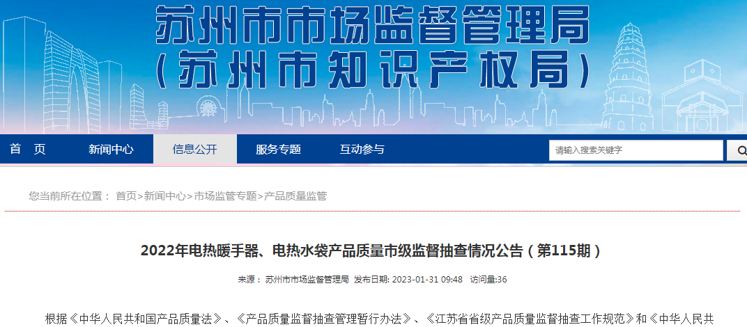 中国质量新闻网讯 近日,苏州市市场监督管理局发布2022年电热暖手器、电热水袋产品质量市级监督抽查情况公告(第115期)。